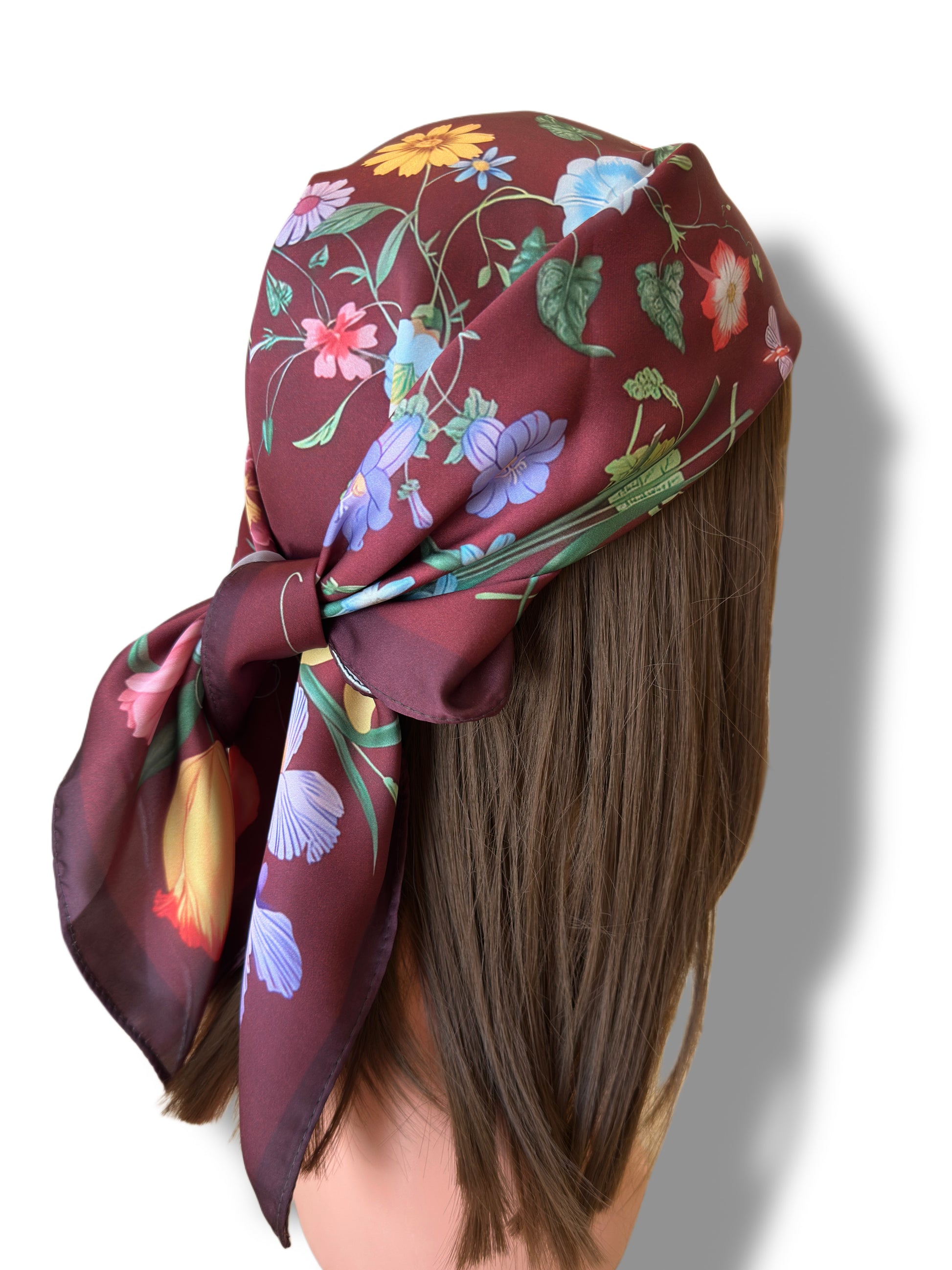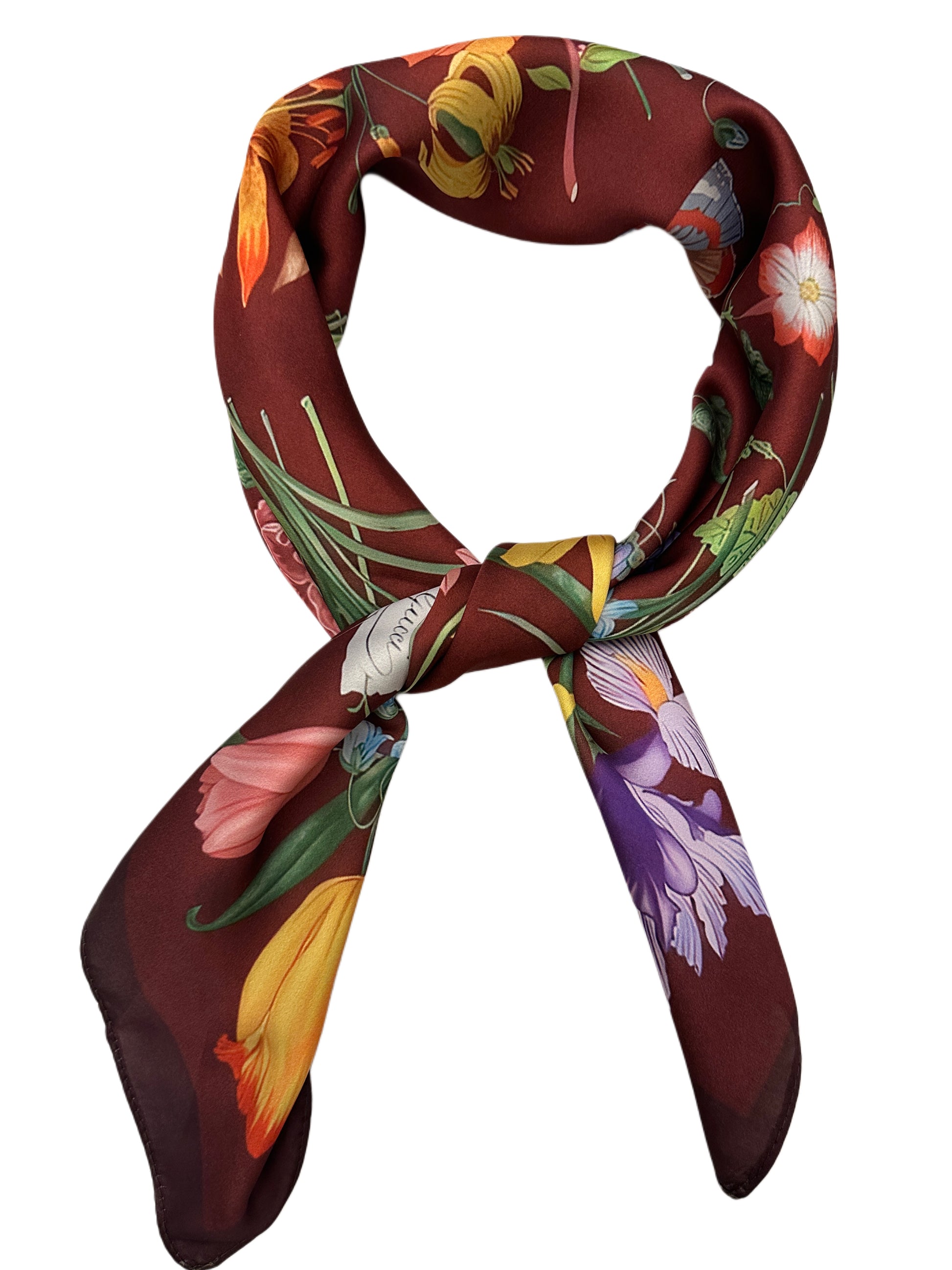 A luxurious silk scarf adorned with vibrant blooming flowers on a deep burgundy background. Perfect for adding a touch of elegance and color to both casual and chic outfits.