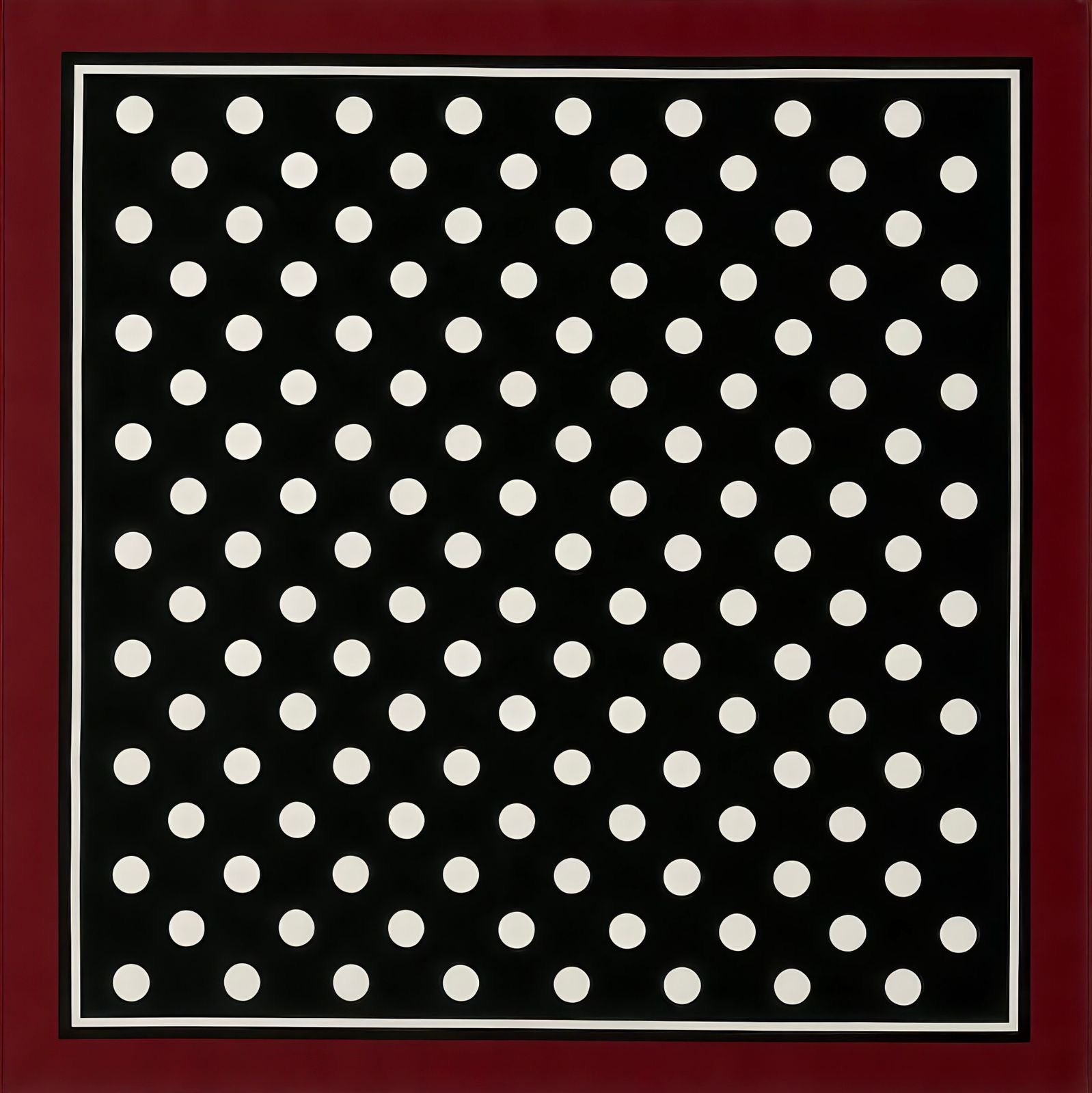 Elegant black silk satin scarf with refined white polka dots and burgundy borders. Perfect for adding a refined touch to both classic and modern looks.