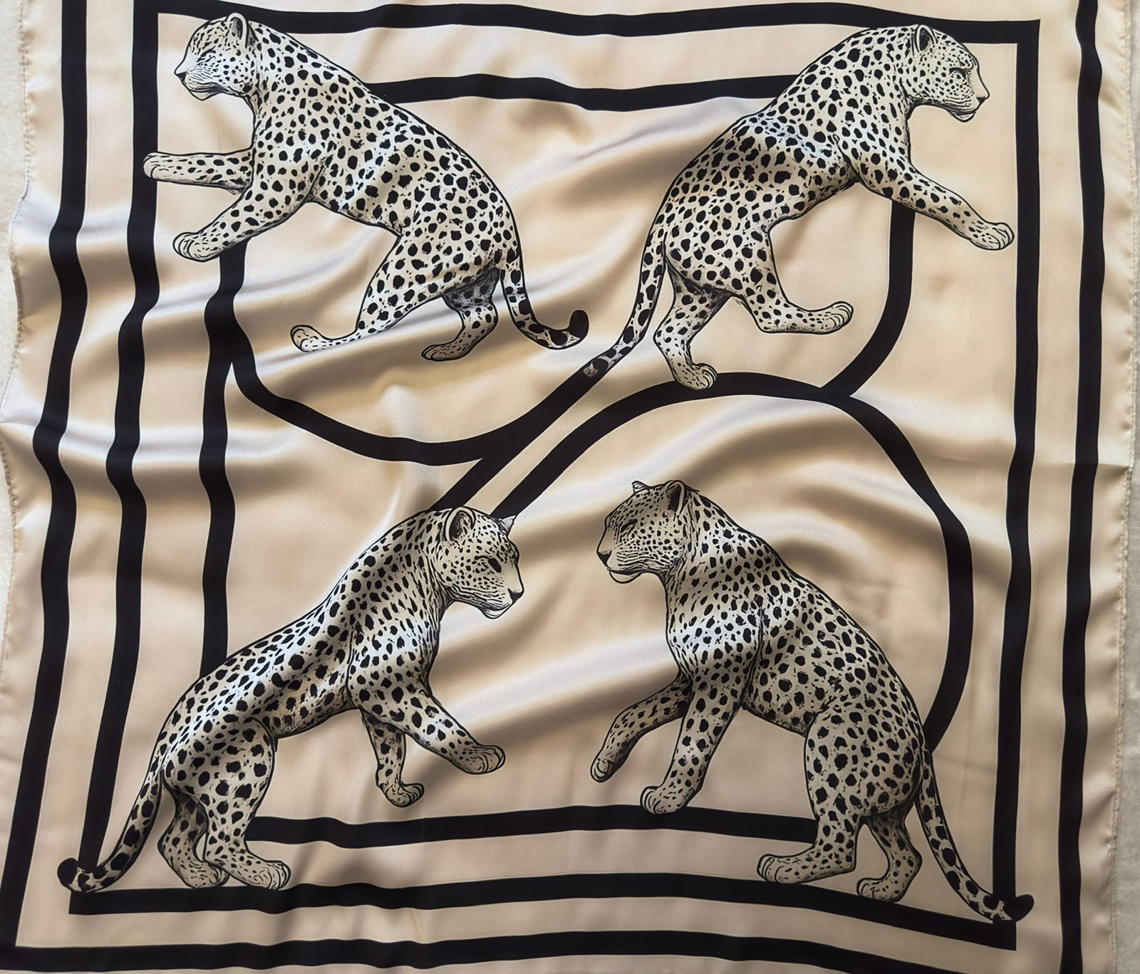A timeless black-and-ivory design with graceful leopards framed in bold geometry. Sophisticated and modern.