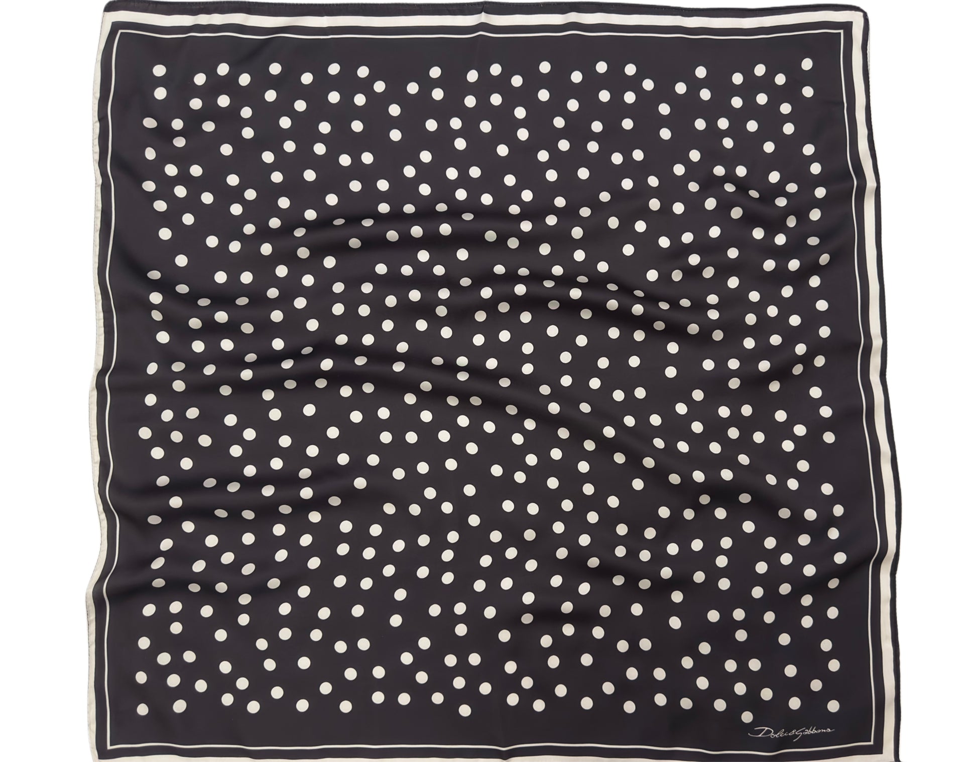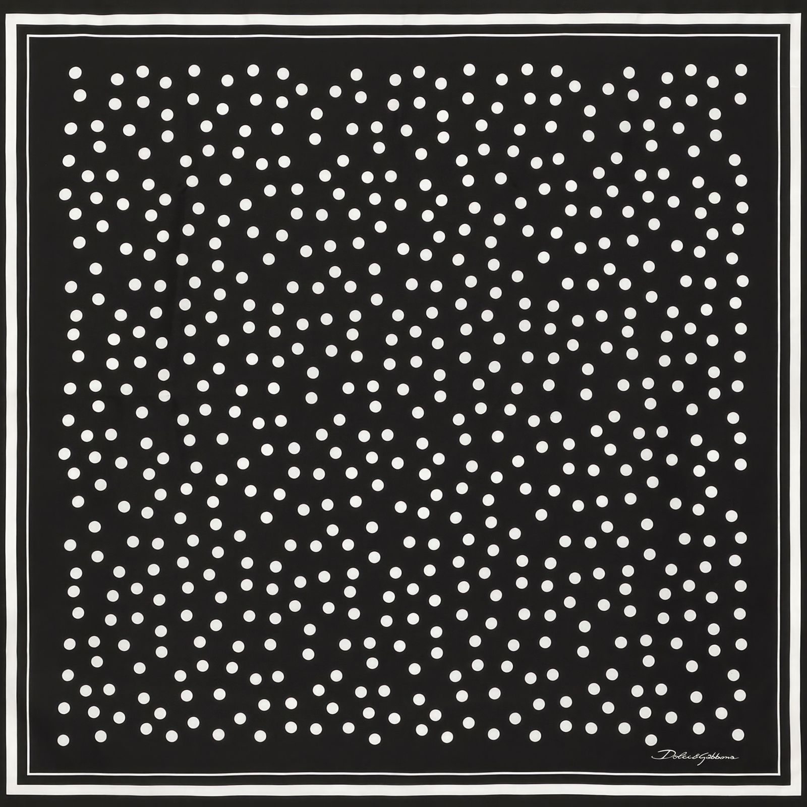 A timeless black scarf adorned with playful white polka dots, blending classic charm with modern minimalism. Perfect for adding a chic touch to both casual and evening looks.