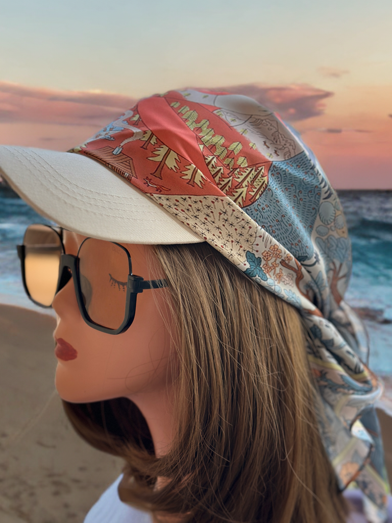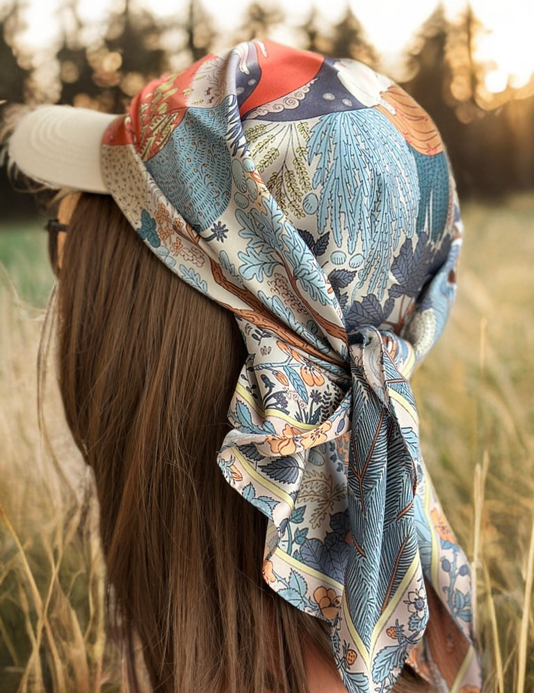 Step into a world of calm with Forest Dream — a poetic design featuring a woman wrapped in nature, surrounded by trees, flowers, and woodland creatures. With soft earthy tones and intricate details, this scarf captures the essence of serenity, imagination, and connection to the wild.