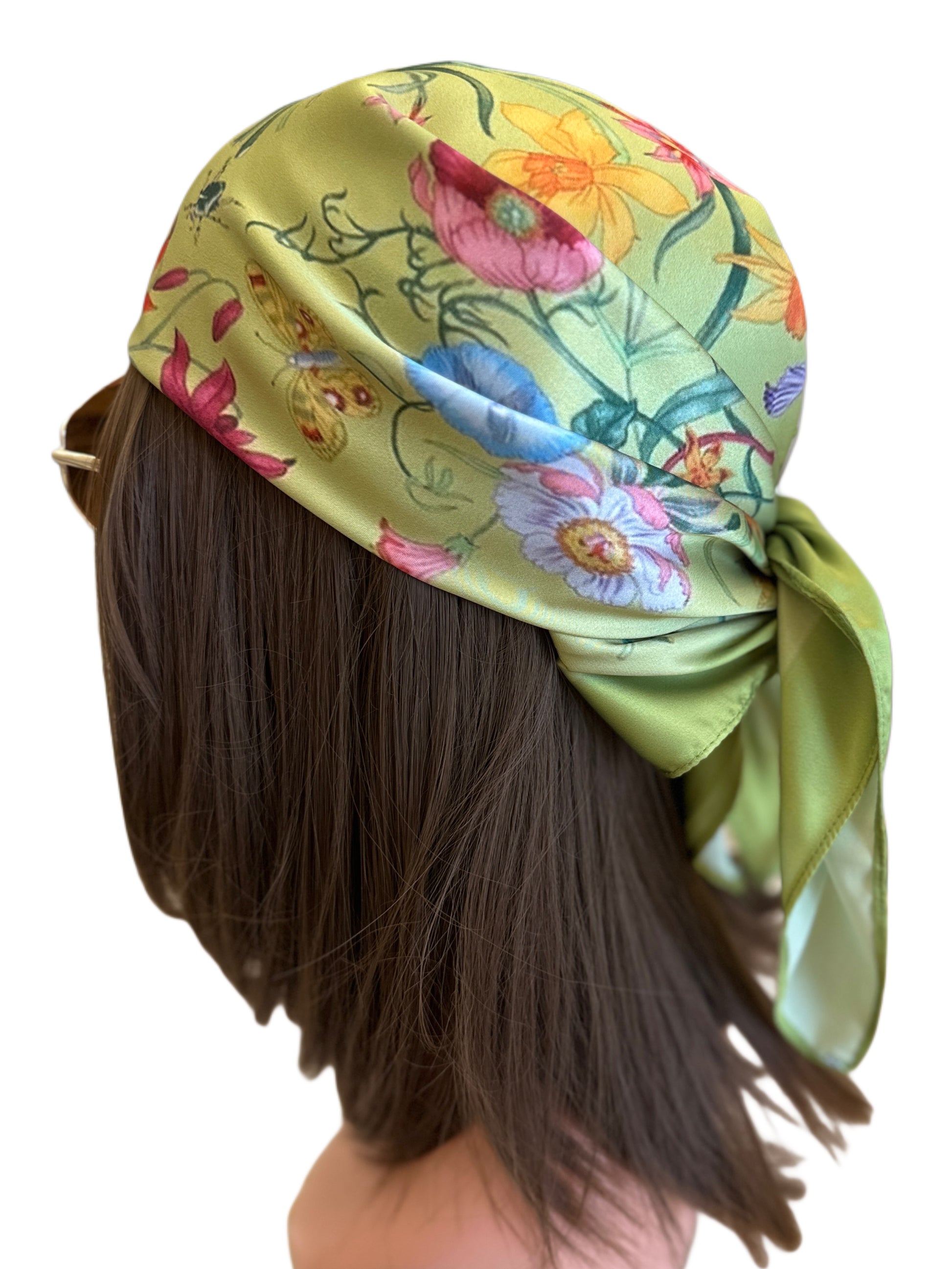 A fresh green scarf filled with colorful blooming flowers. Light, cheerful, and perfect for spring days.