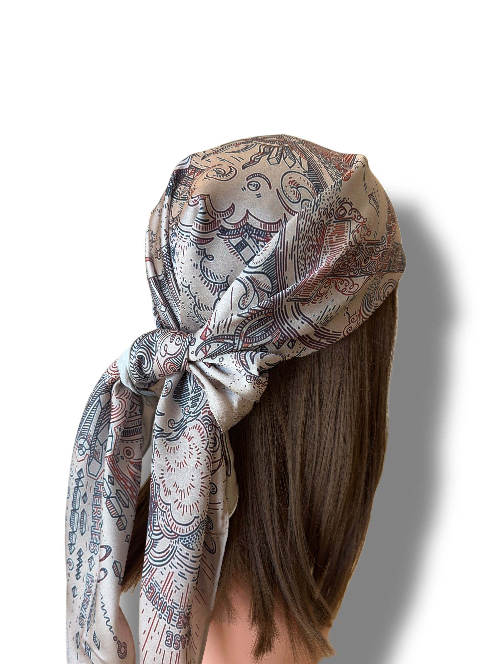 A dreamy, cosmic journey illustrated with clouds, camels, and a majestic central “H” emblem. This scarf blends mythical fantasy with intricate hand-drawn details, evoking a magical adventure through time and space.