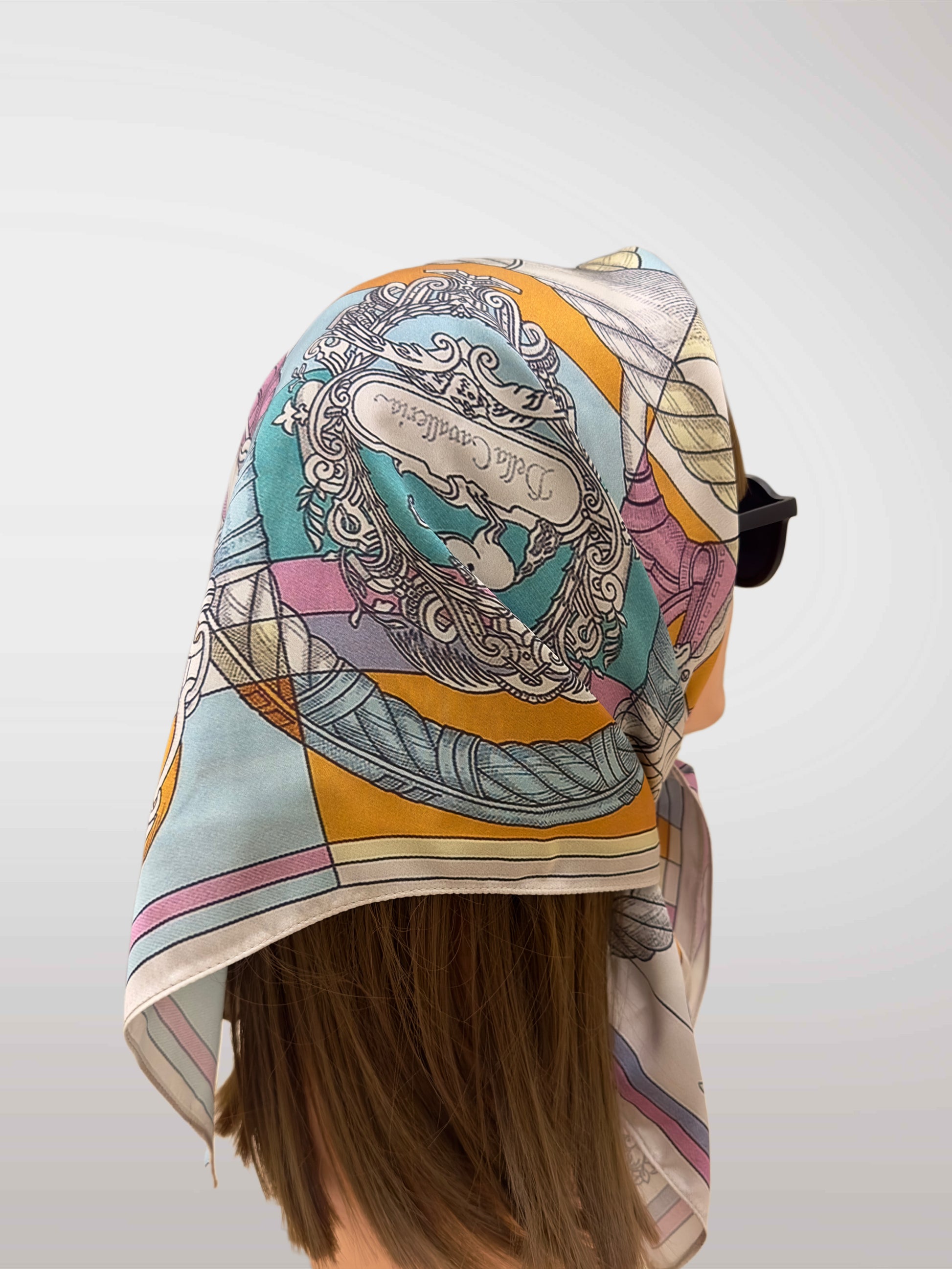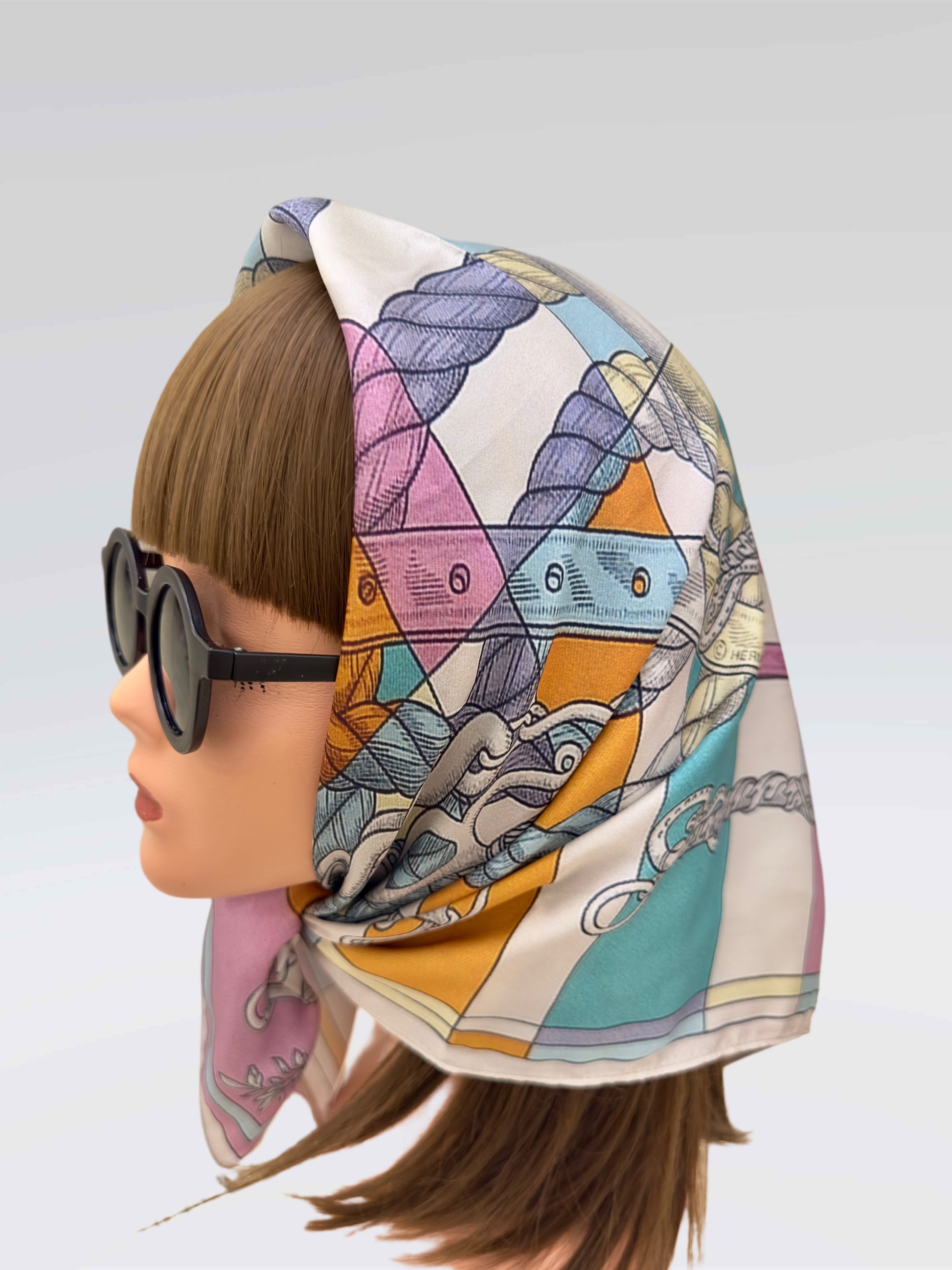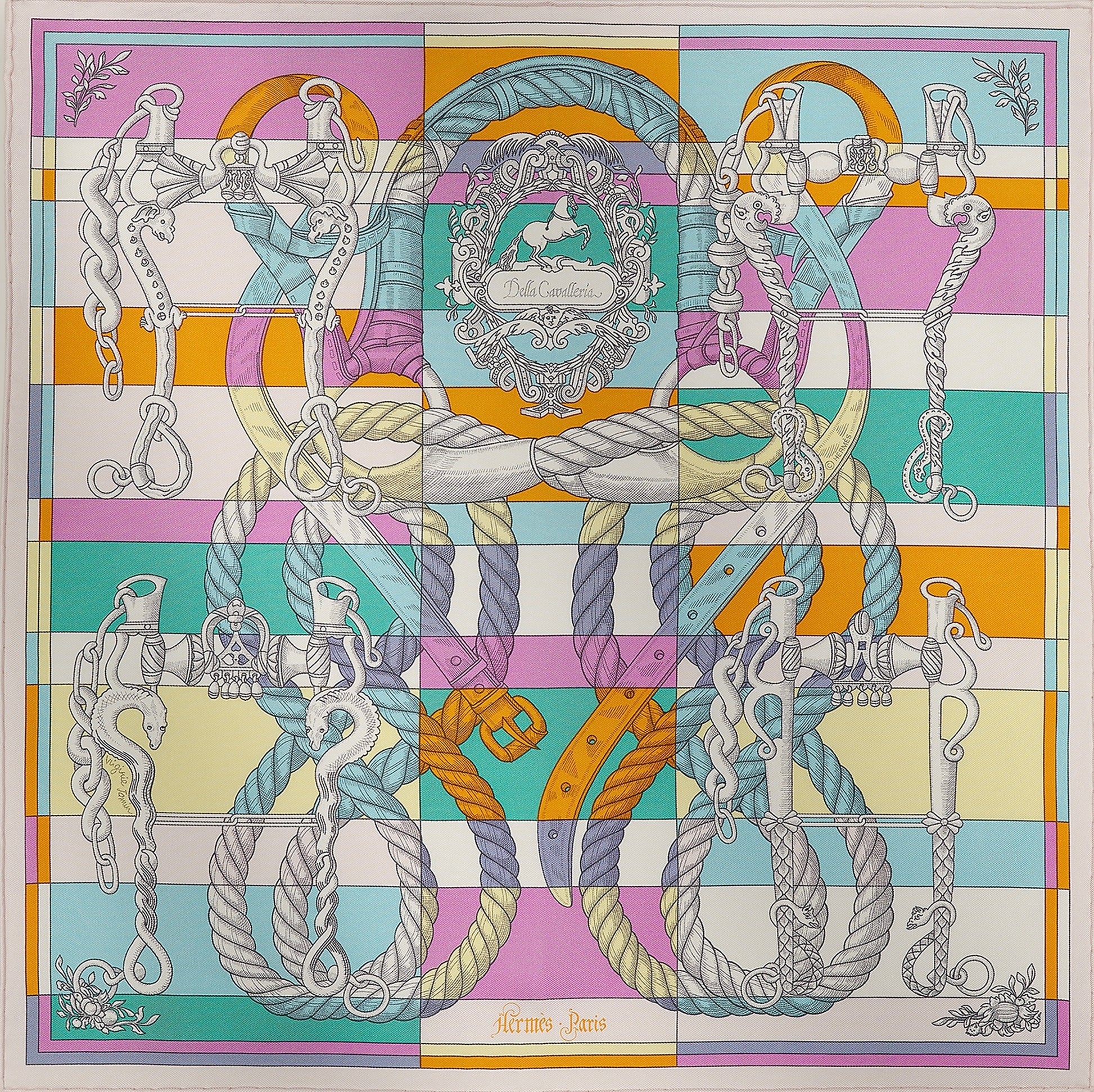 Inspired by equestrian elegance, this scarf features intricate bridles and ropes over pastel checkered panels. A collector’s piece celebrating Hermès’ signature style.