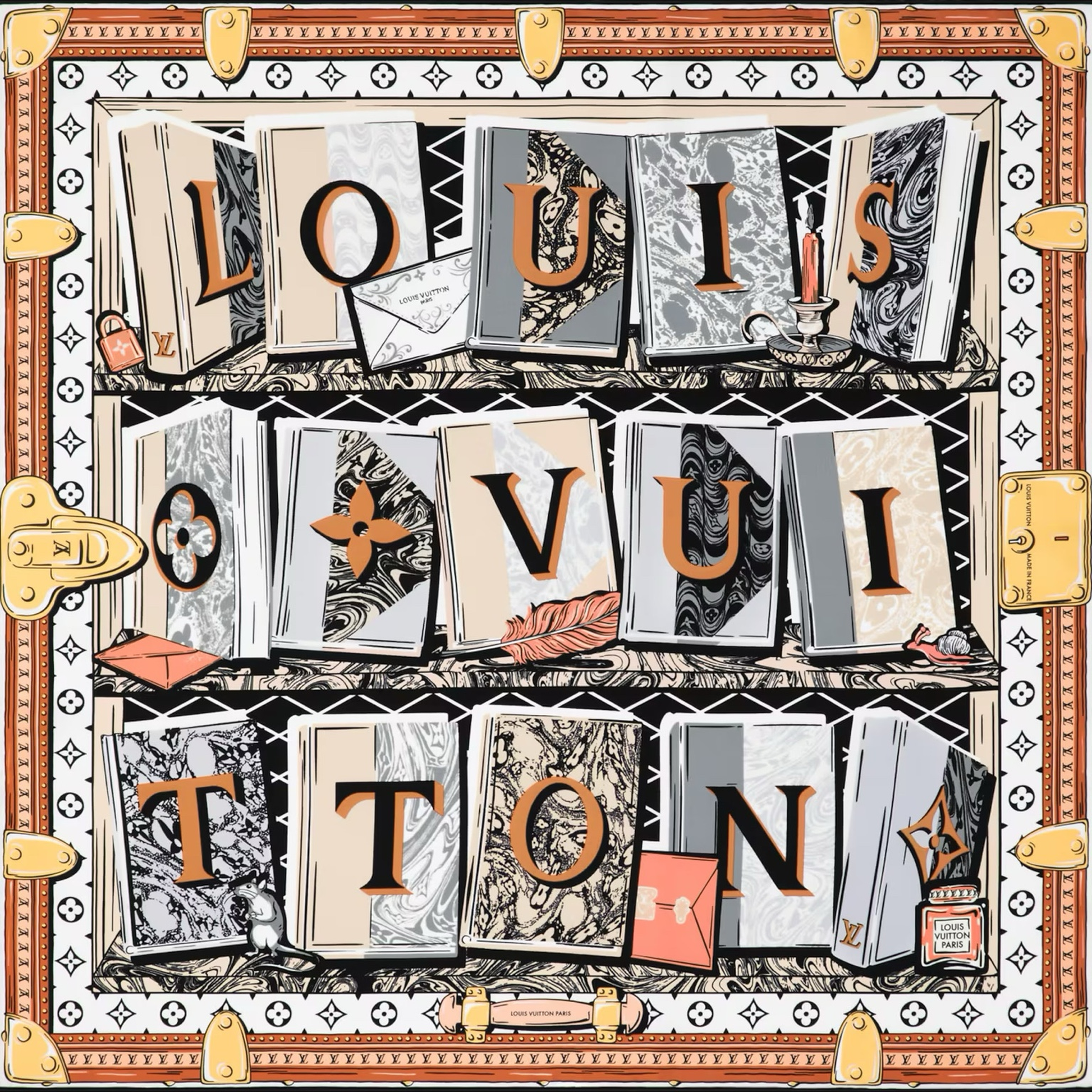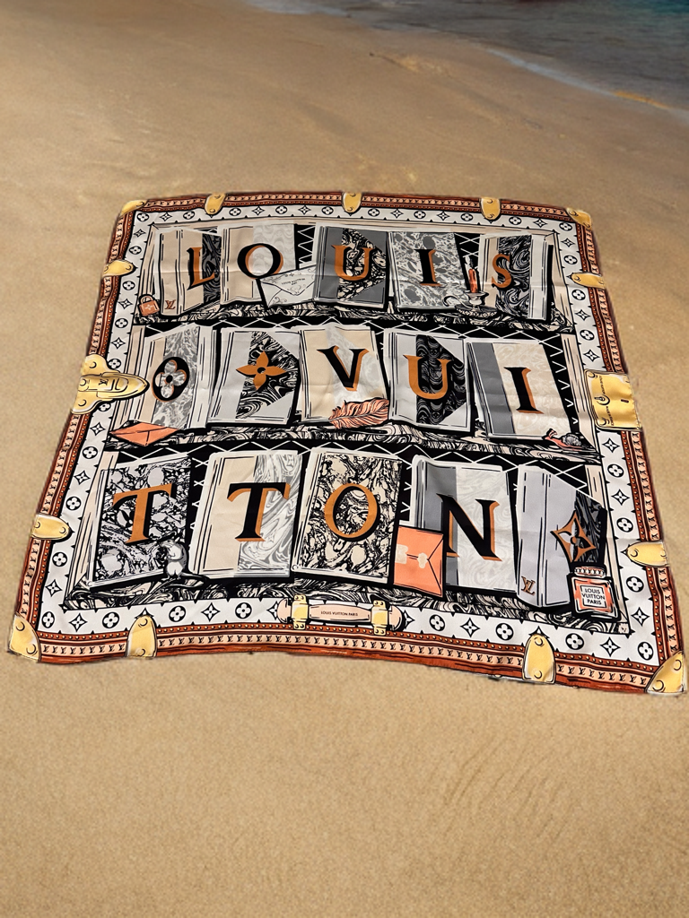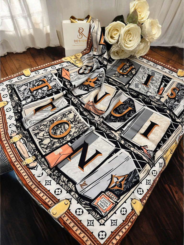 An artistic and imaginative scarf showcasing books arranged to spell out “LOUIS VUITTON,” set against vintage patterns and charming travel-inspired motifs. A collector’s dream piece combining literature and luxury.