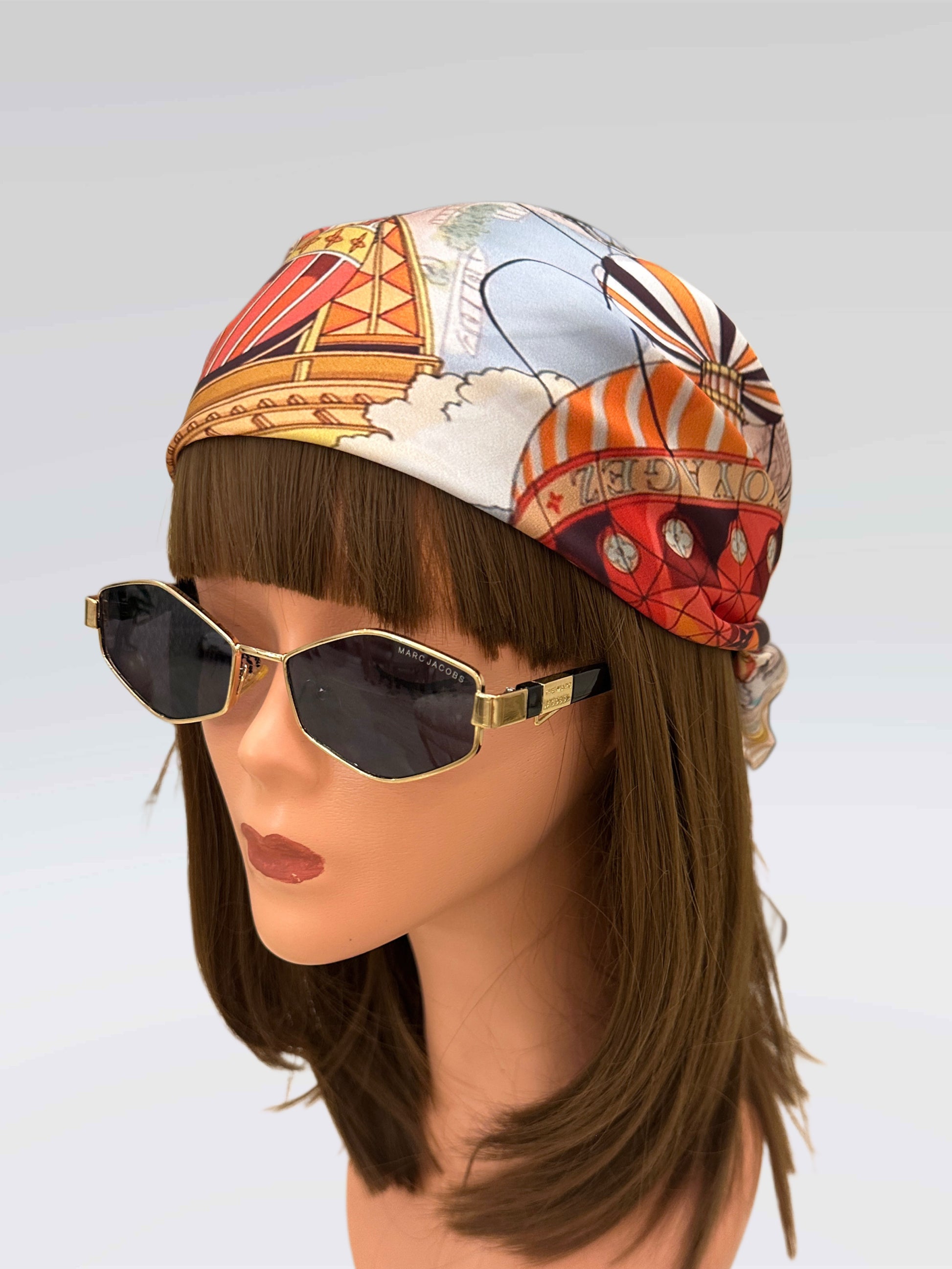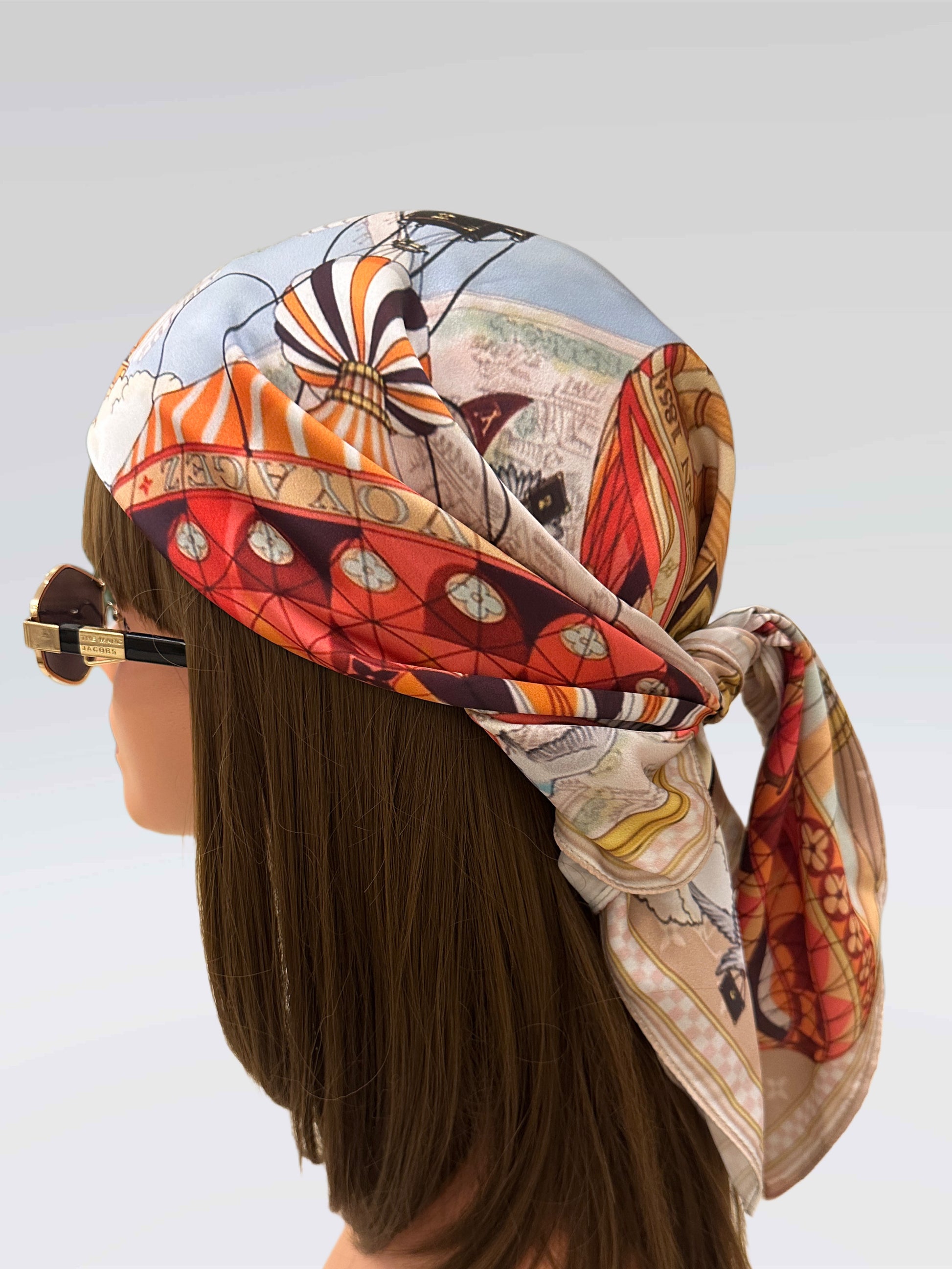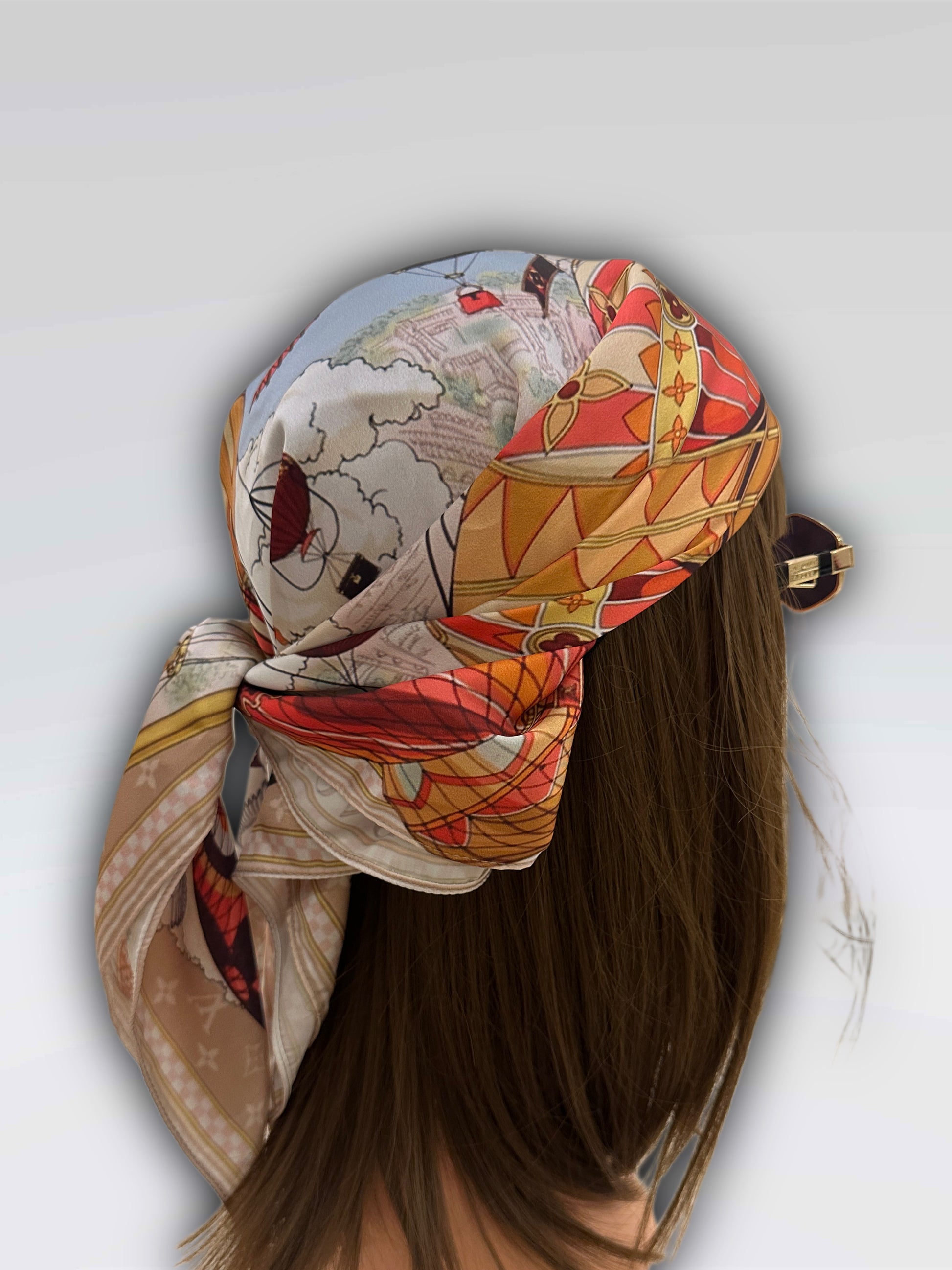 A whimsical journey through the skies of Paris, this LV scarf features hot air balloons adorned with Louis Vuitton trunks, flying over a dreamy map backdrop. Romantic, colorful, and rich in travel fantasy.