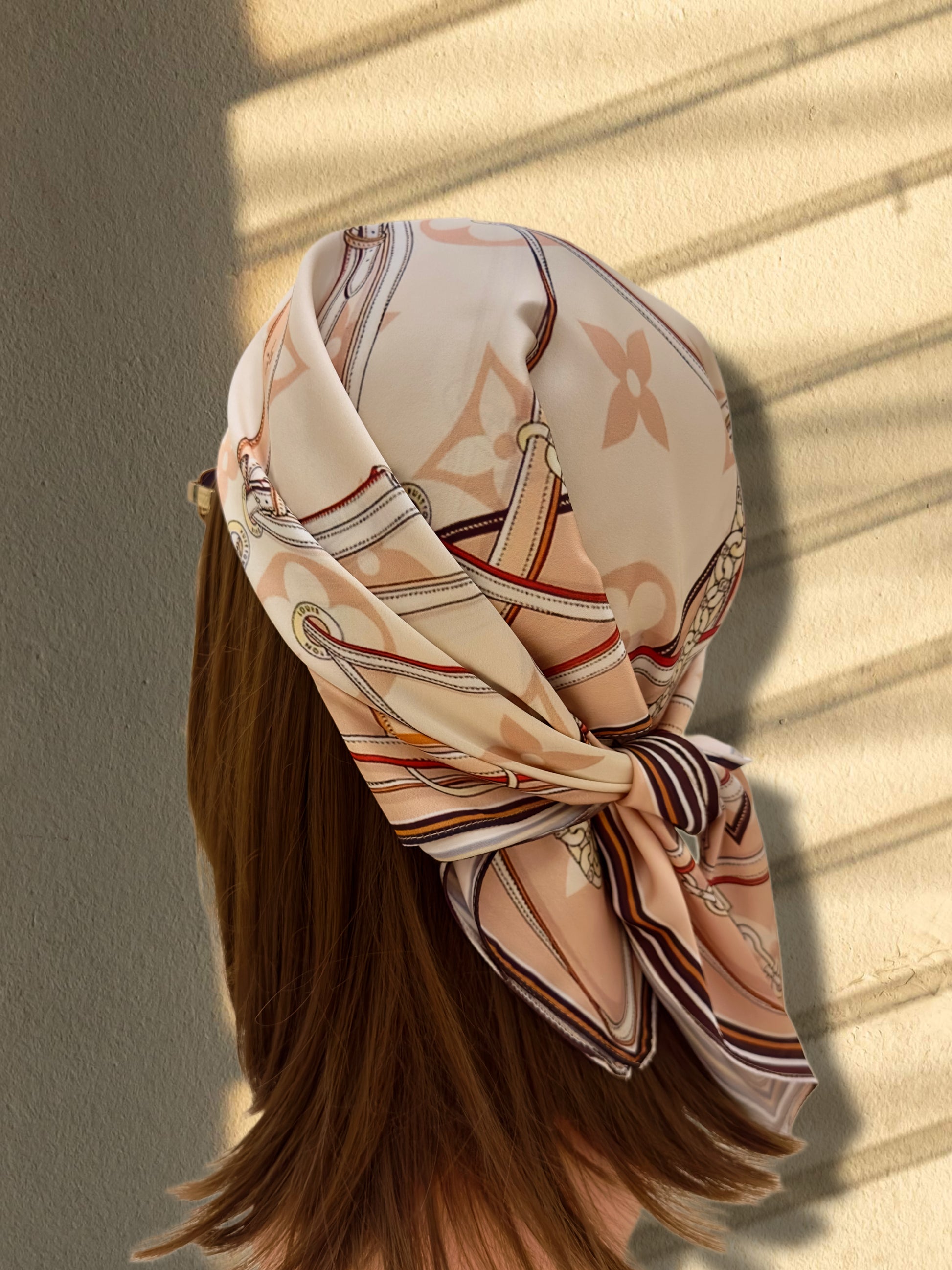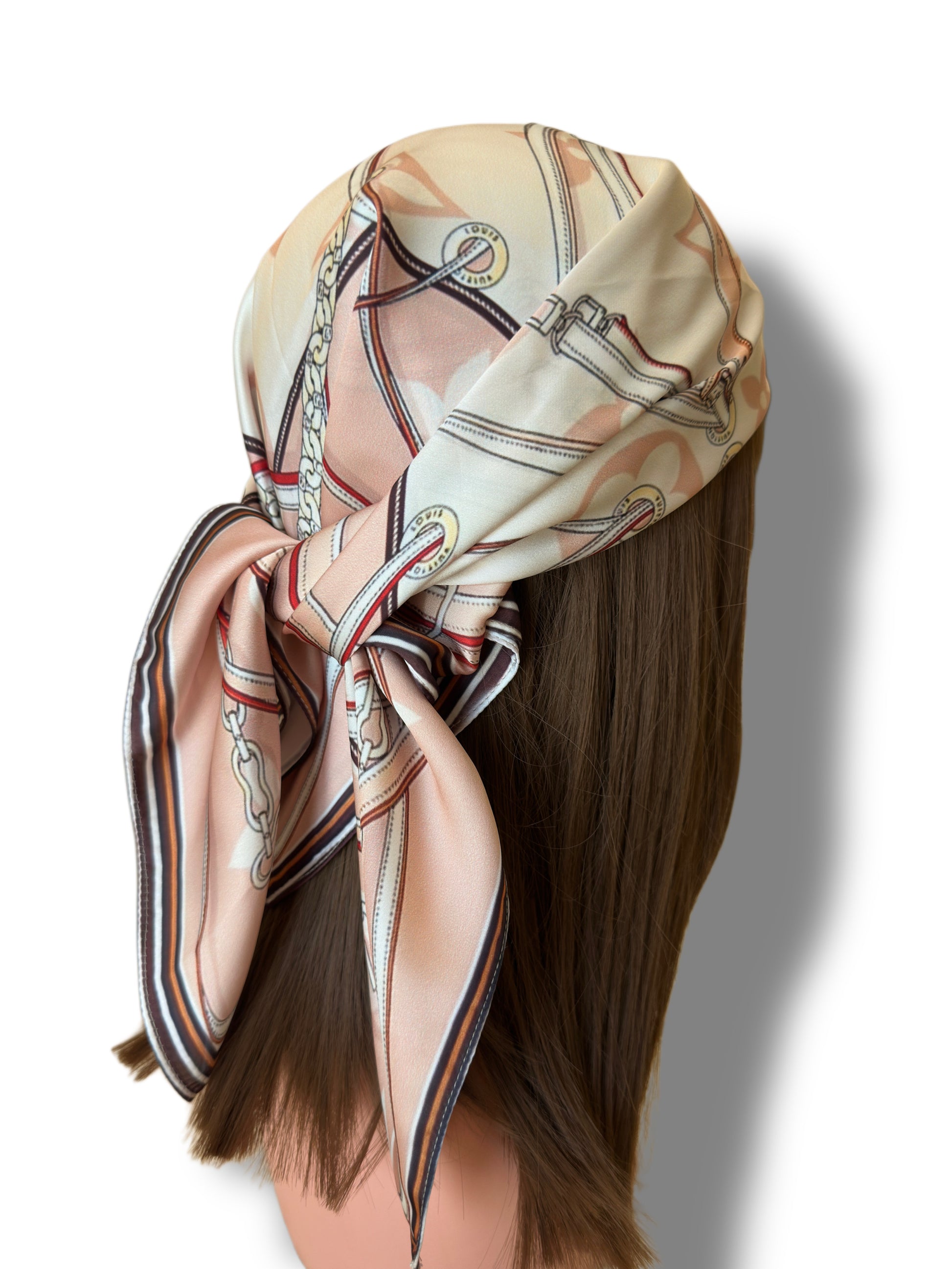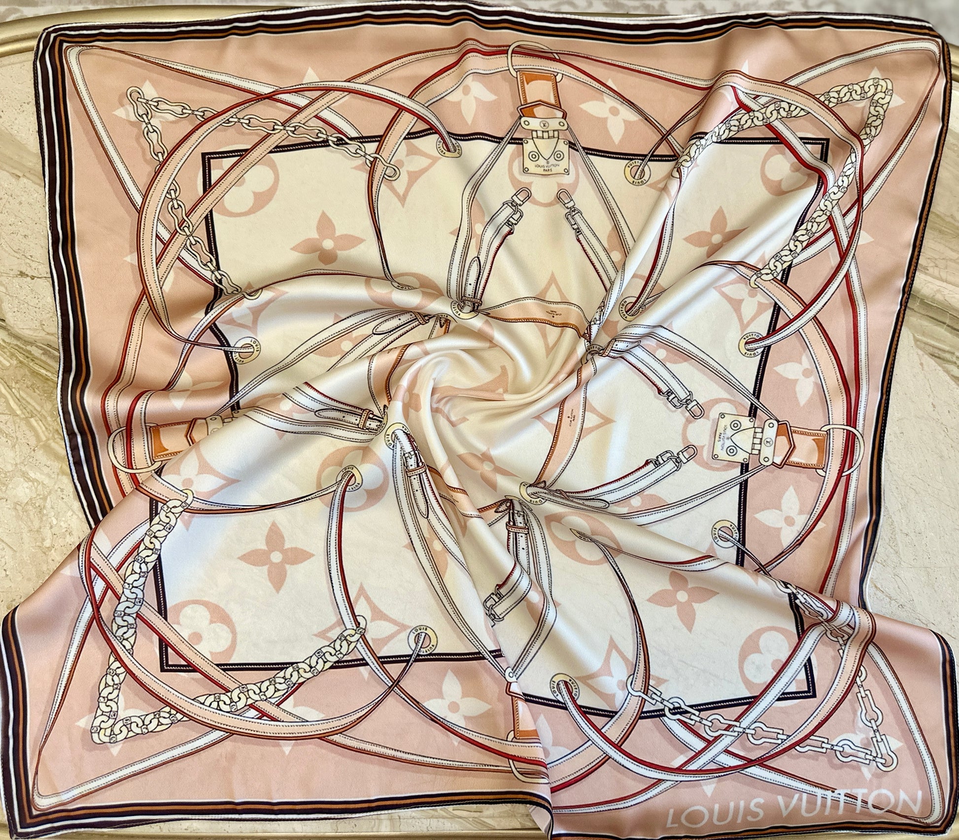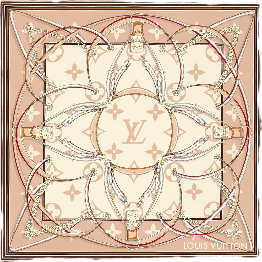 Inspired by luxury craftsmanship, this scarf features detailed illustrations of leather straps, buckles, and chains arranged in a symmetrical layout. A refined and chic piece reflecting Louis Vuitton’s heritage in travel and design.