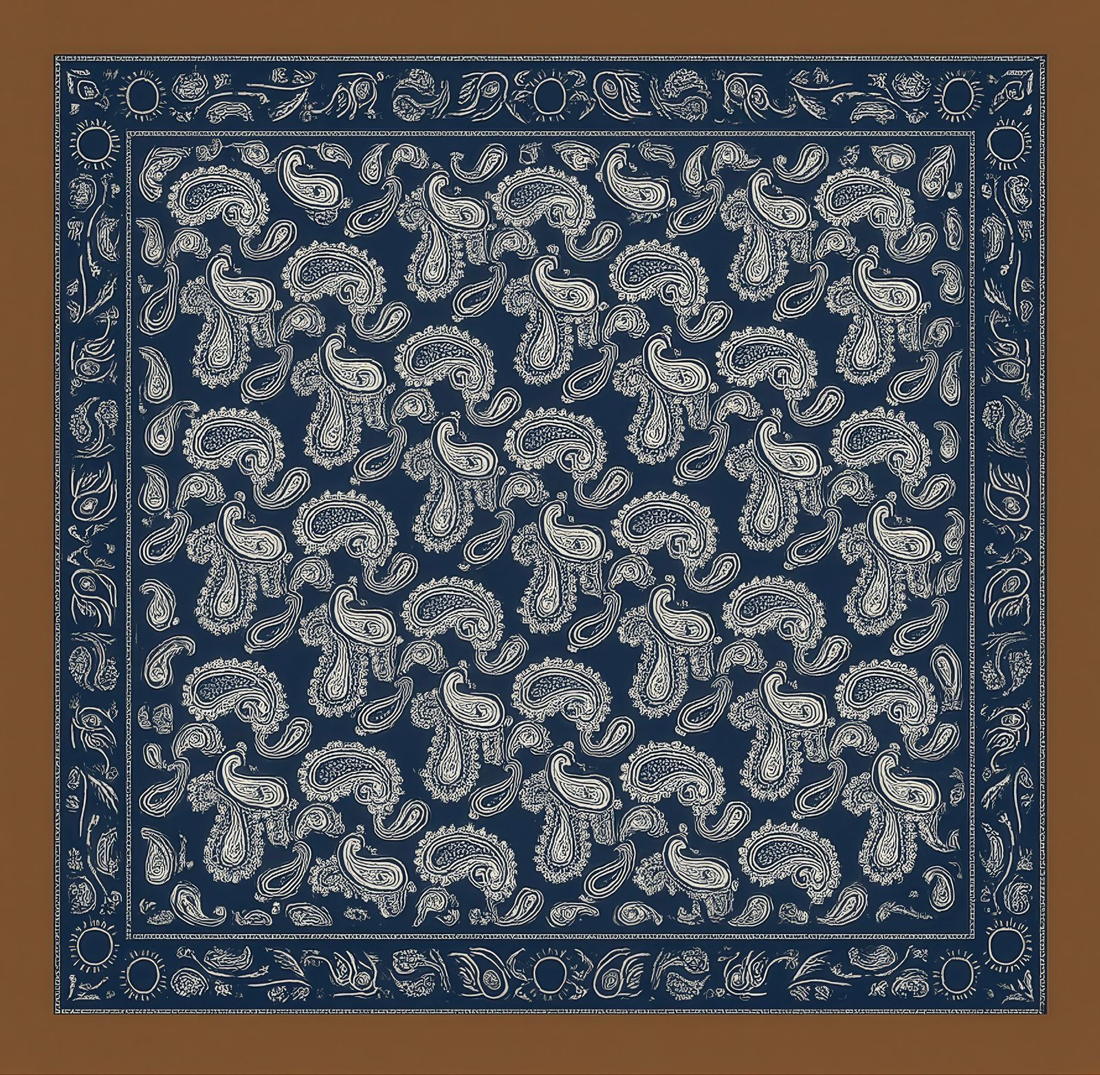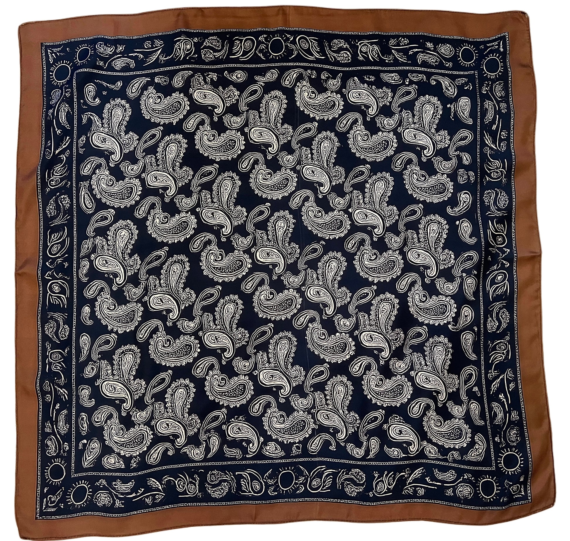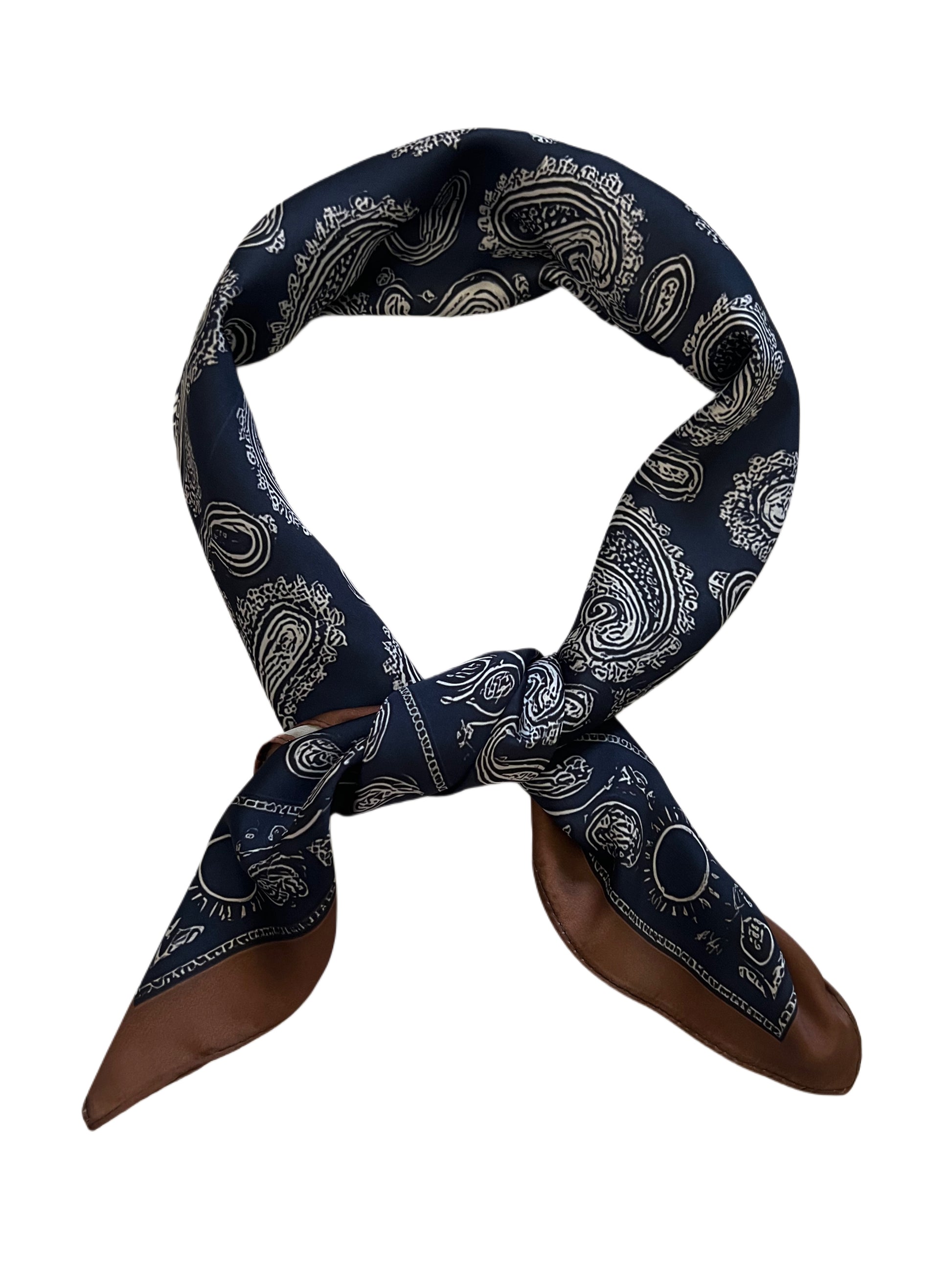 A timeless navy scarf featuring a refined paisley pattern framed with a warm brown border. Ideal with tailored blazers or denim for a polished, effortless look.