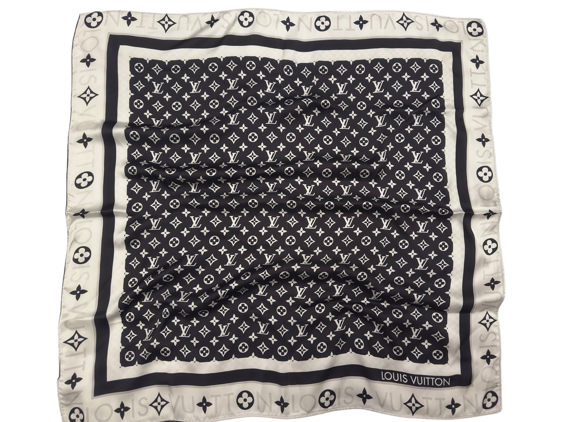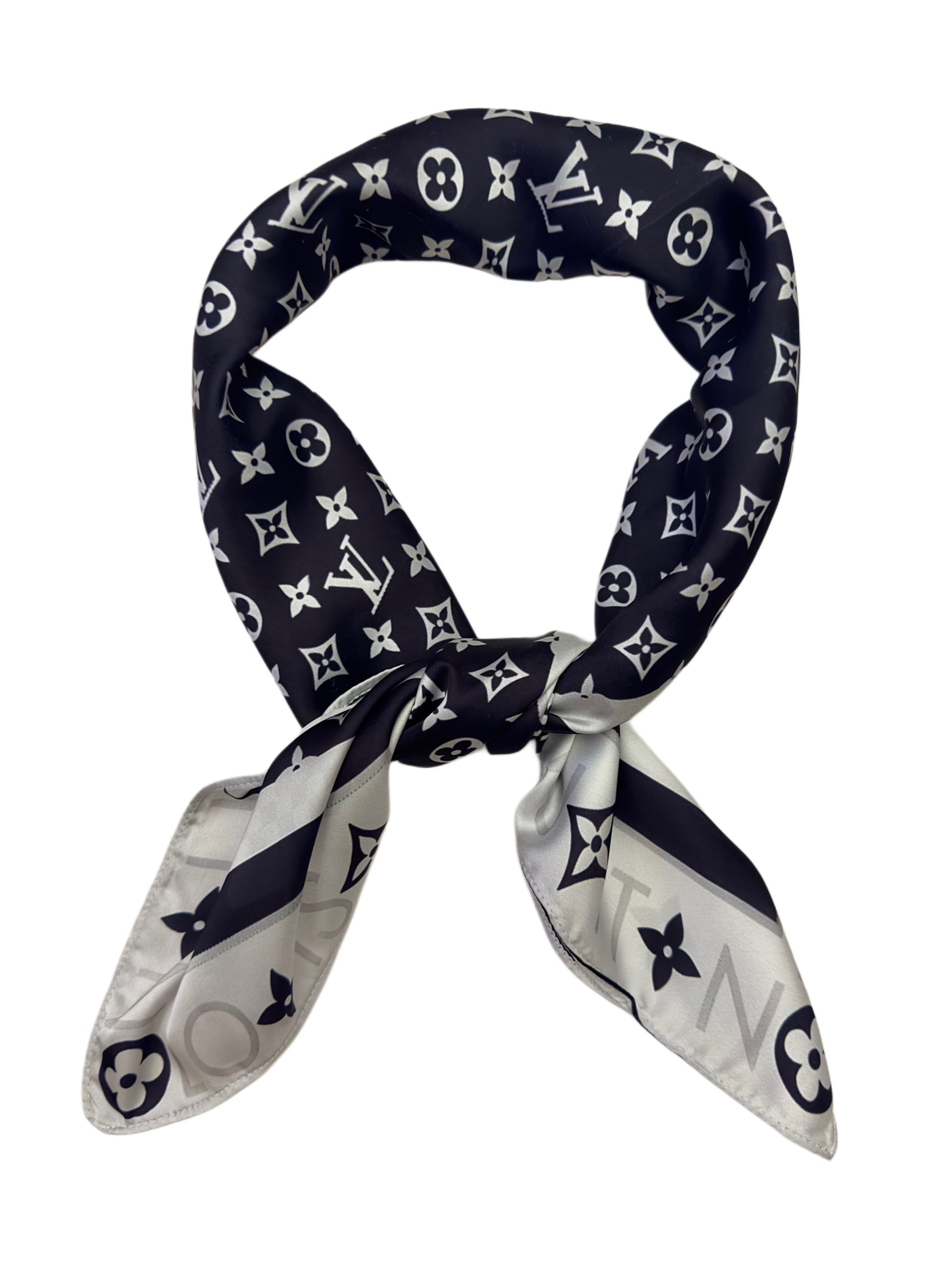 A refined silk scarf showcasing the iconic monogram of LV in bold black and white, exuding effortless sophistication and Parisian charm.