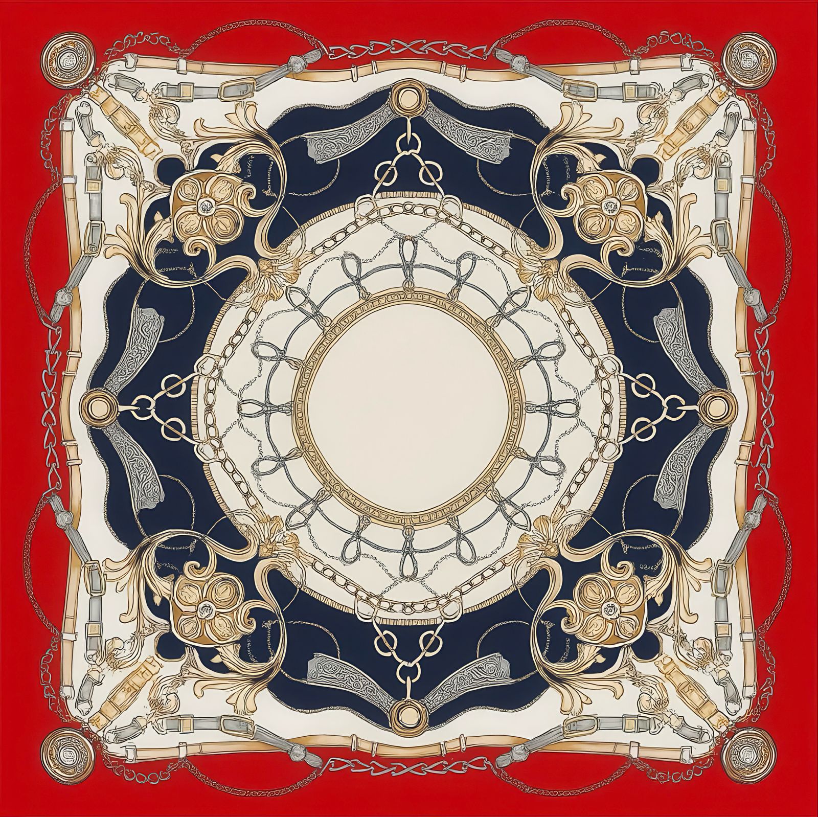Elegant scarf with gold chain and floral details on navy and red — adds a classy touch to any outfit.