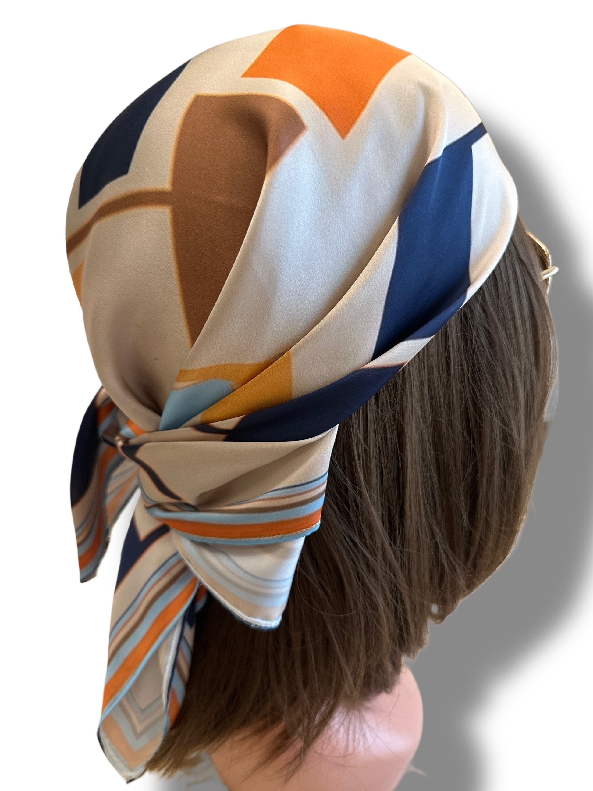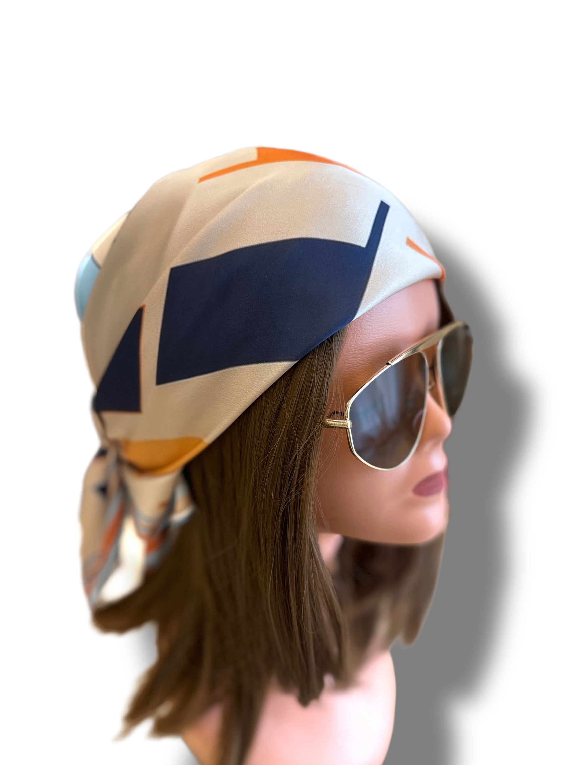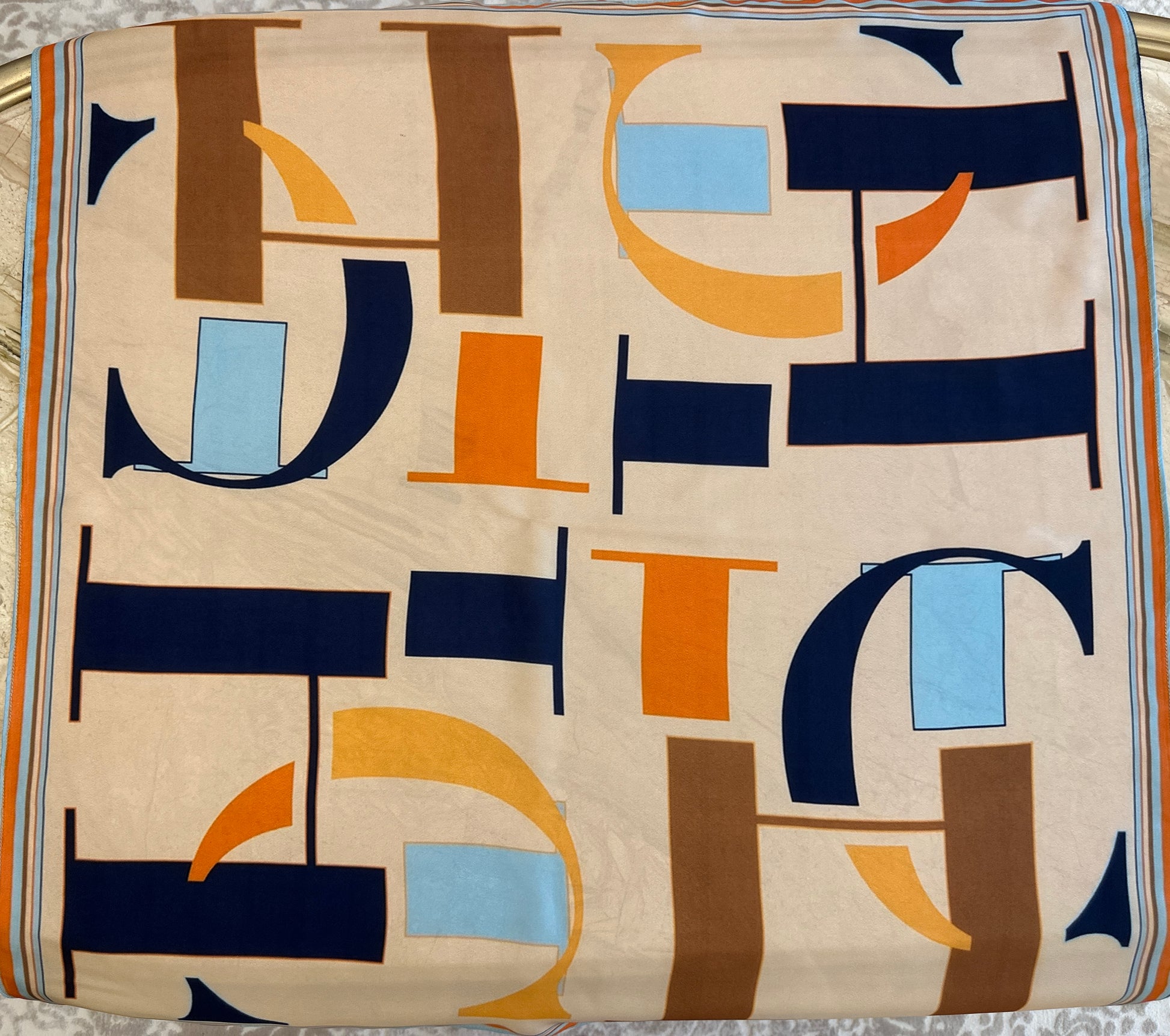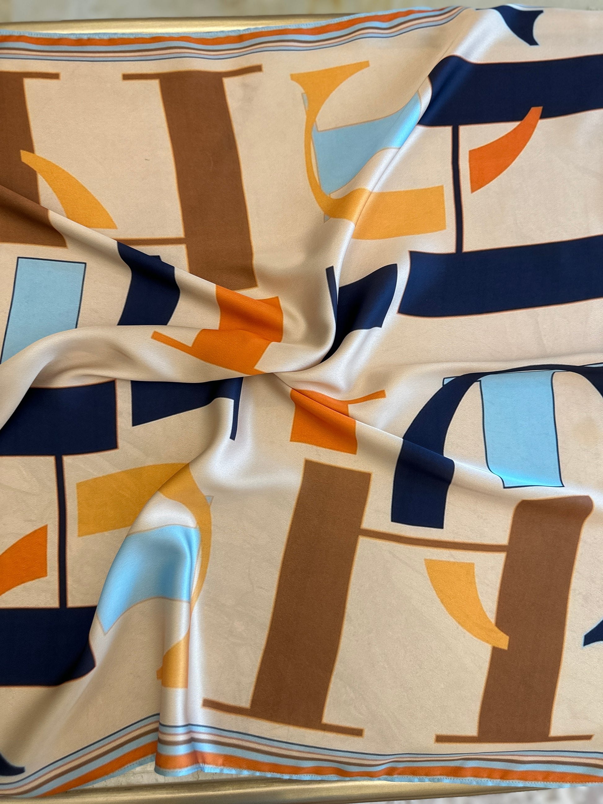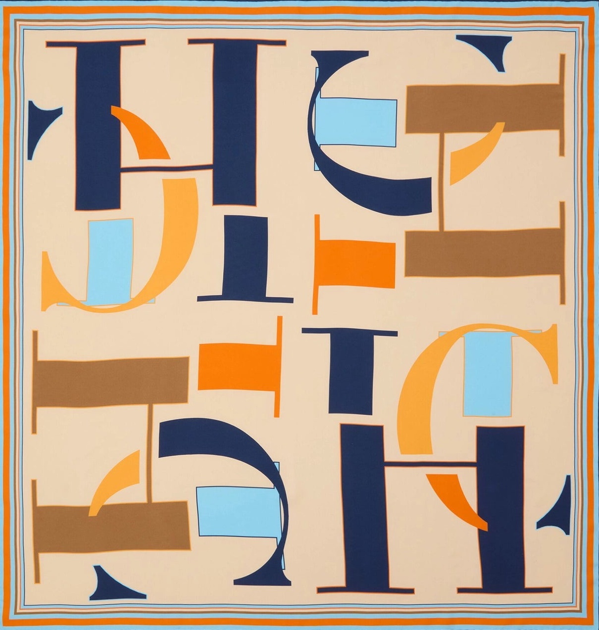 A modern geometric composition inspired by CH “Carolina Herrera” with oversized, abstract letterforms in bold navy, orange, brown, and baby blue tones. Perfect for a contemporary, statement-making look.