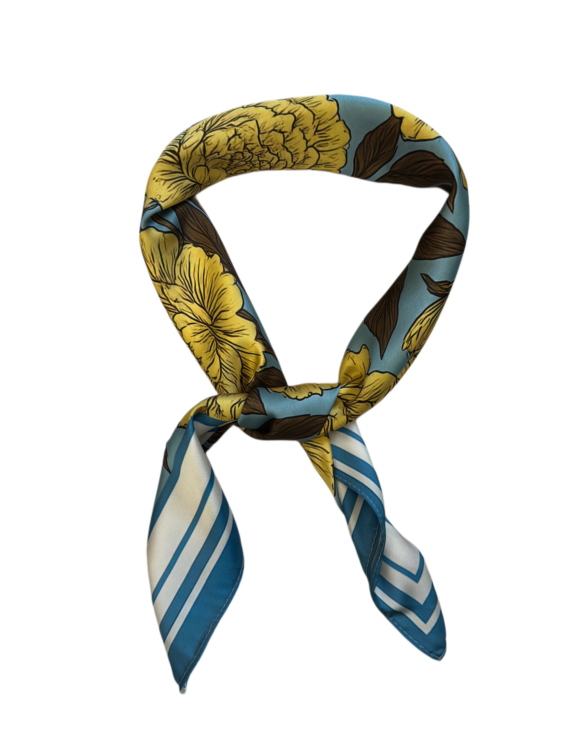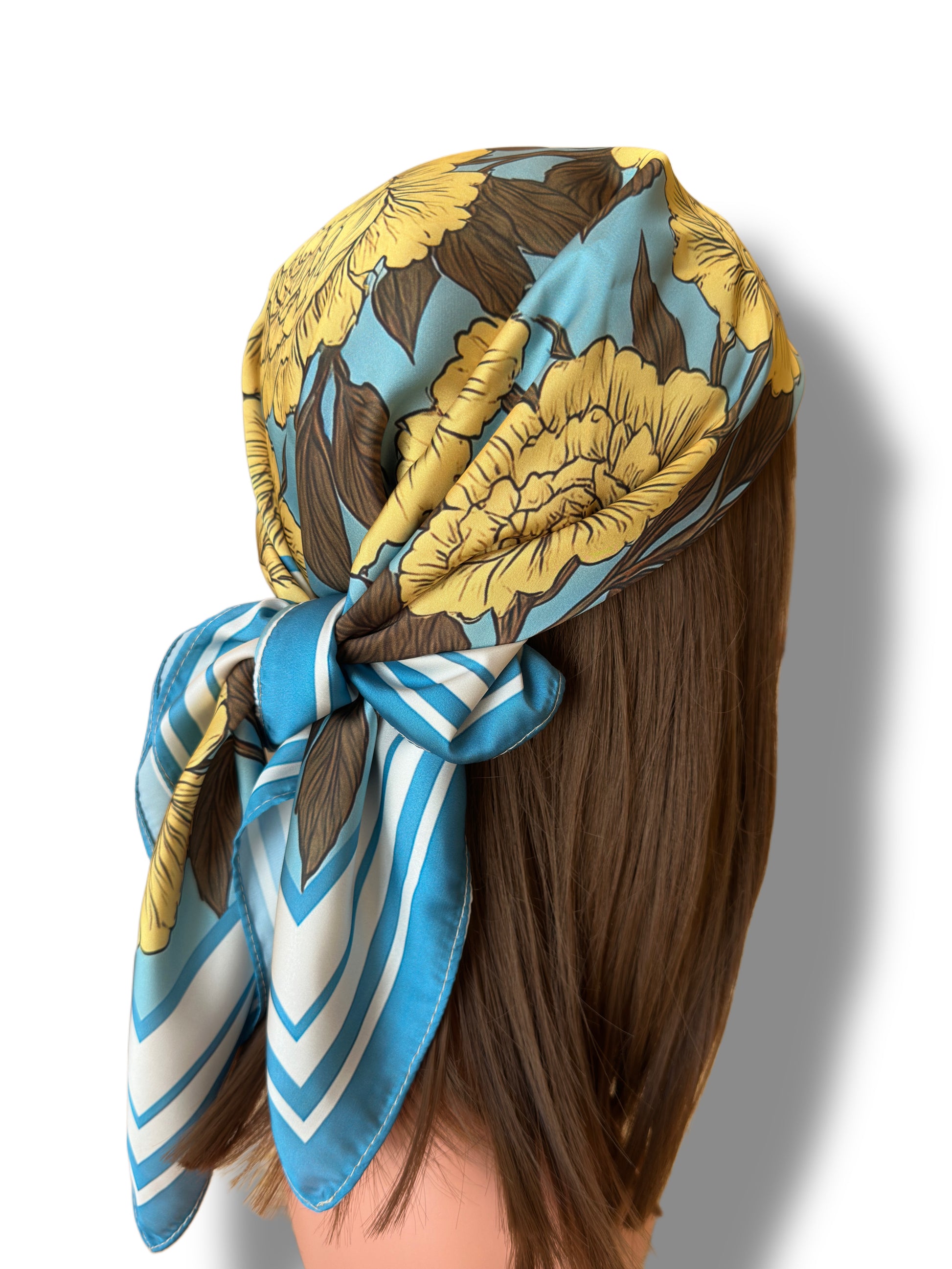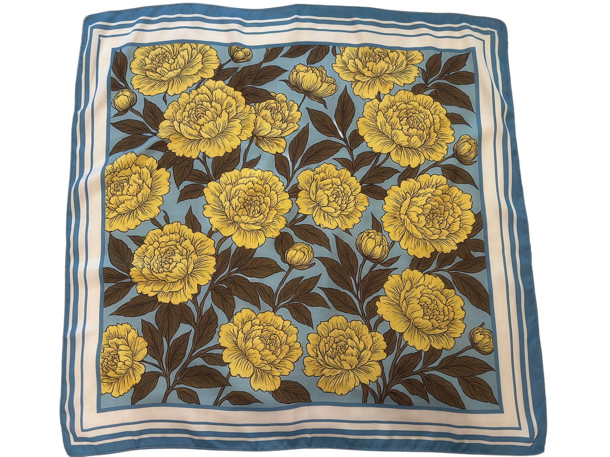 Golden blossoms on a soft blue background create a timeless, elegant look — perfect for daytime outfits, brunches or spring events.